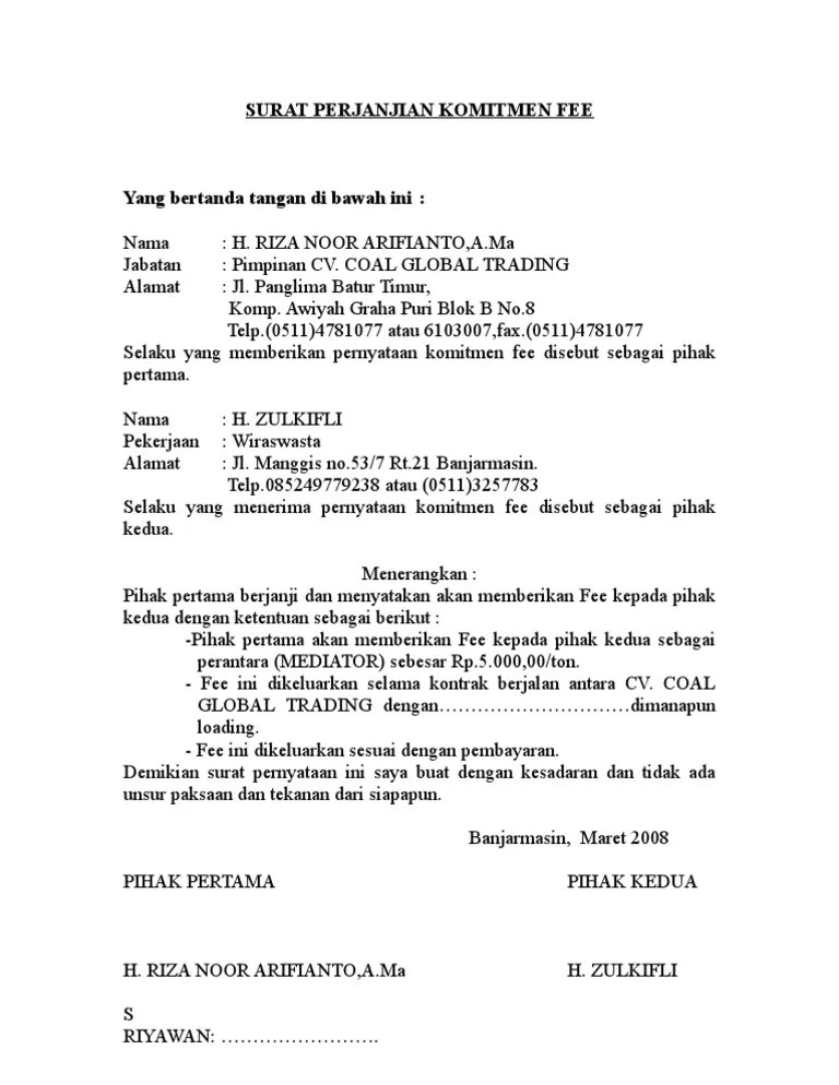 Contoh surat perjanjian komitmen fee contoh komitmen fee. Cara membuat surat untuk fee mediator.
